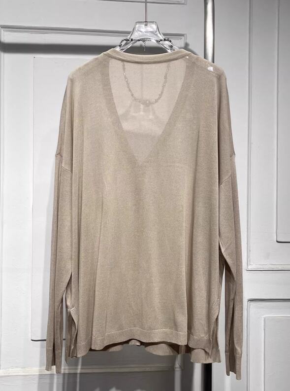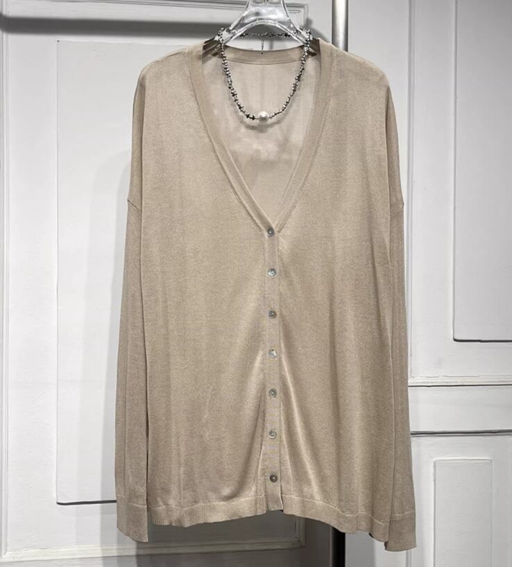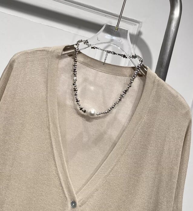 顔まわりをすっきりと見せるVネックが、さりげない品の良さを添えます。