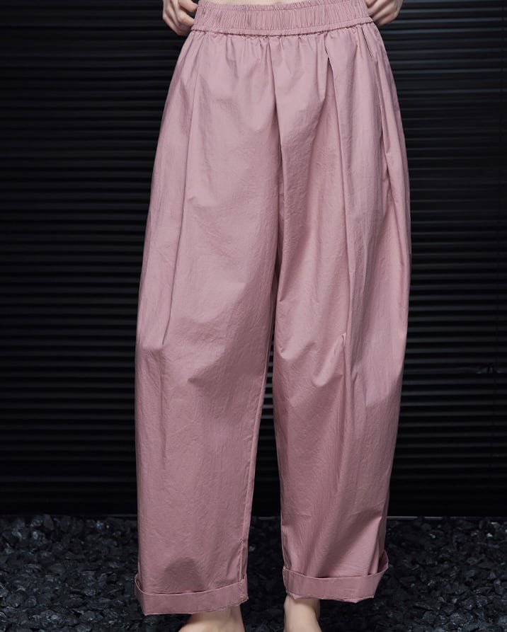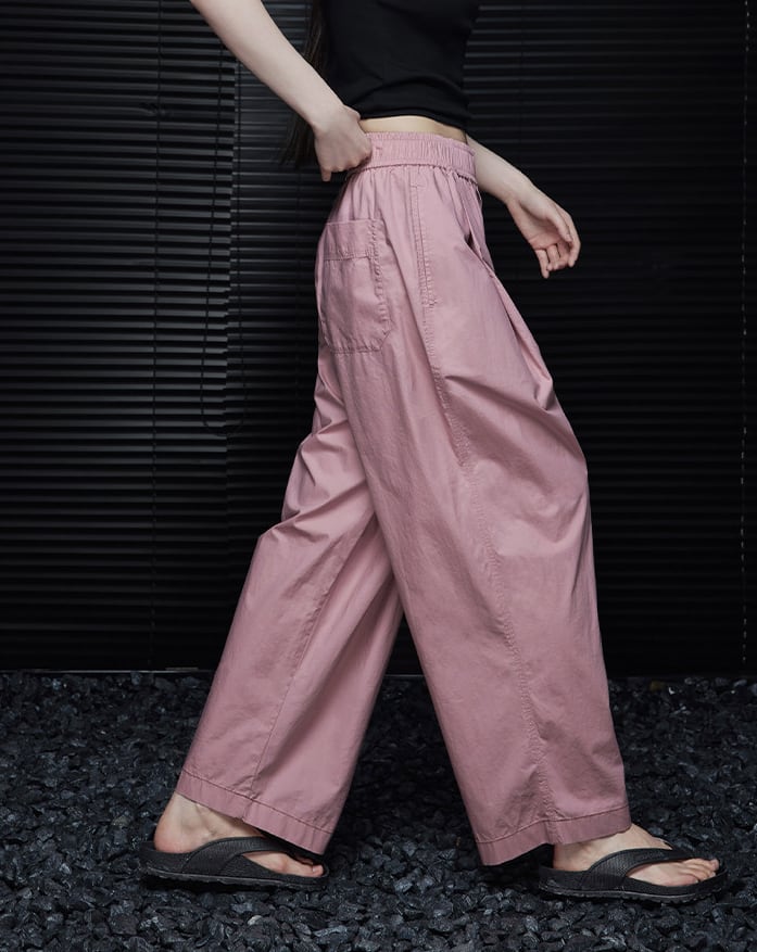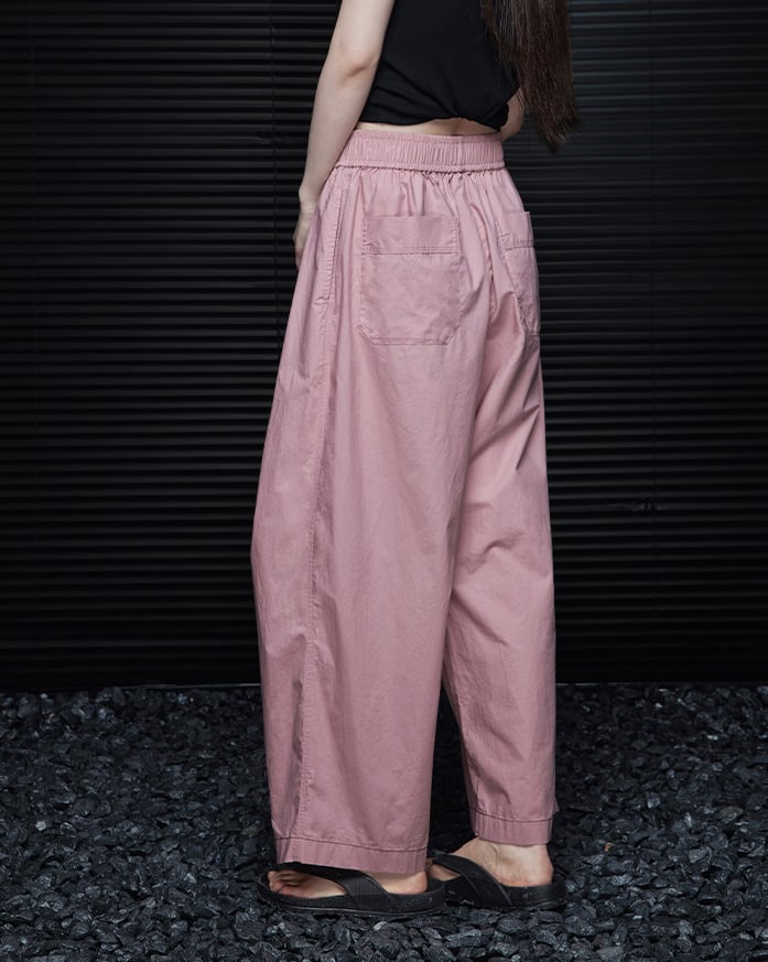 やわらかなコットン素材で仕立てた、優しいピンクのワイドパンツ。