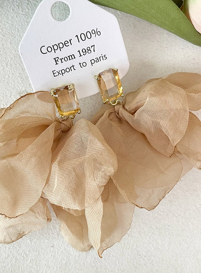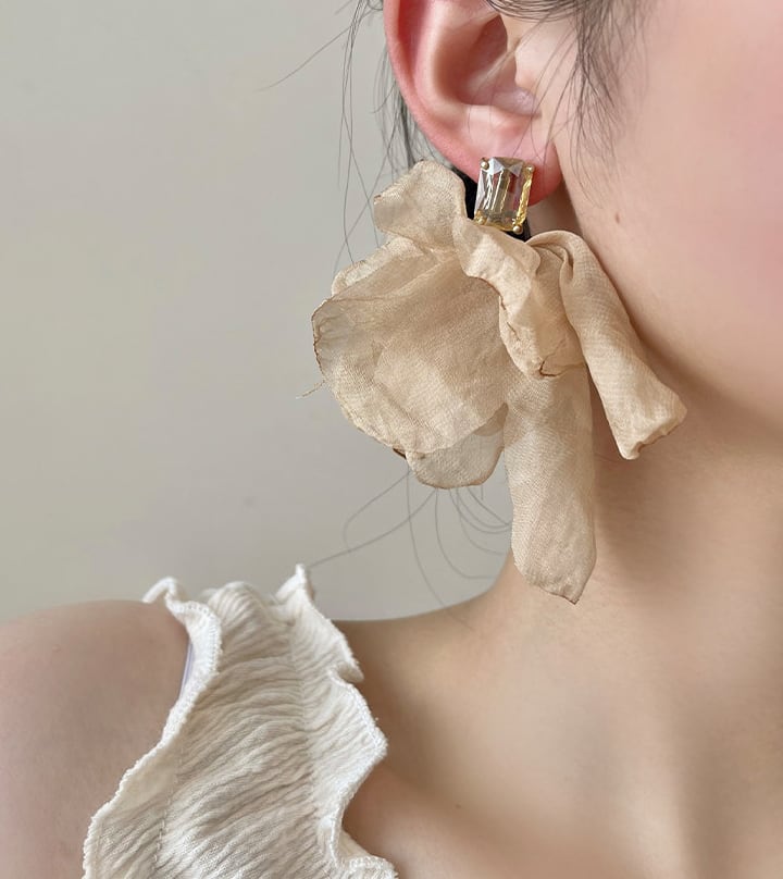 ピーチカラーのシルクサテンで仕立てた、フラワーイヤリング。