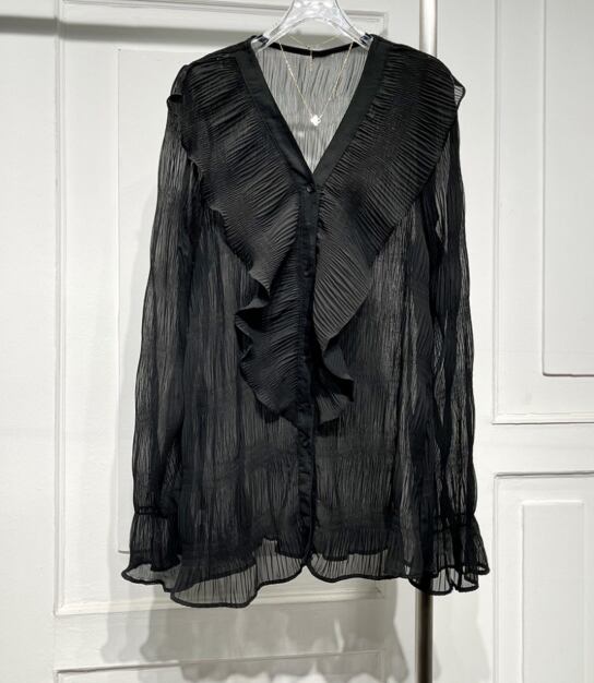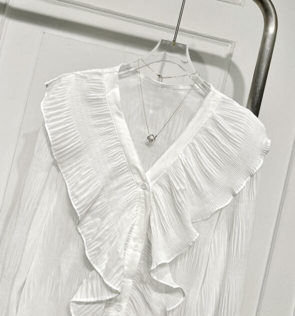 Vネックプリーツシフォンフリルブラウス