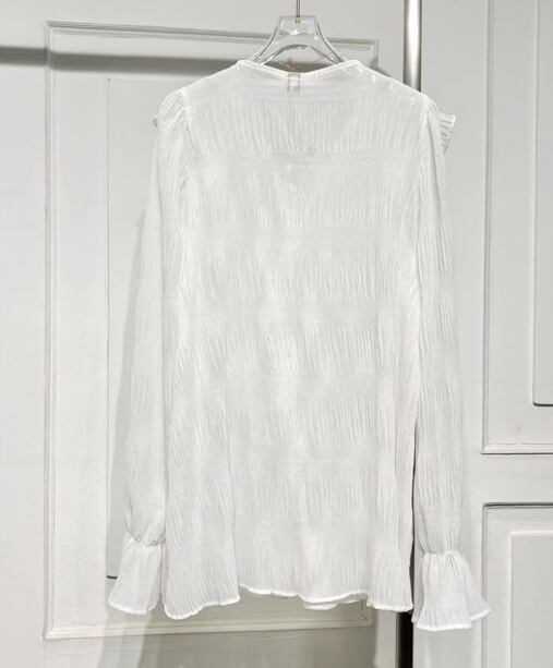 縁取りのフリルや、さりげないギャザー、袖口のシャーリングが、甘さを控えた大人の女性らしさを演出。
