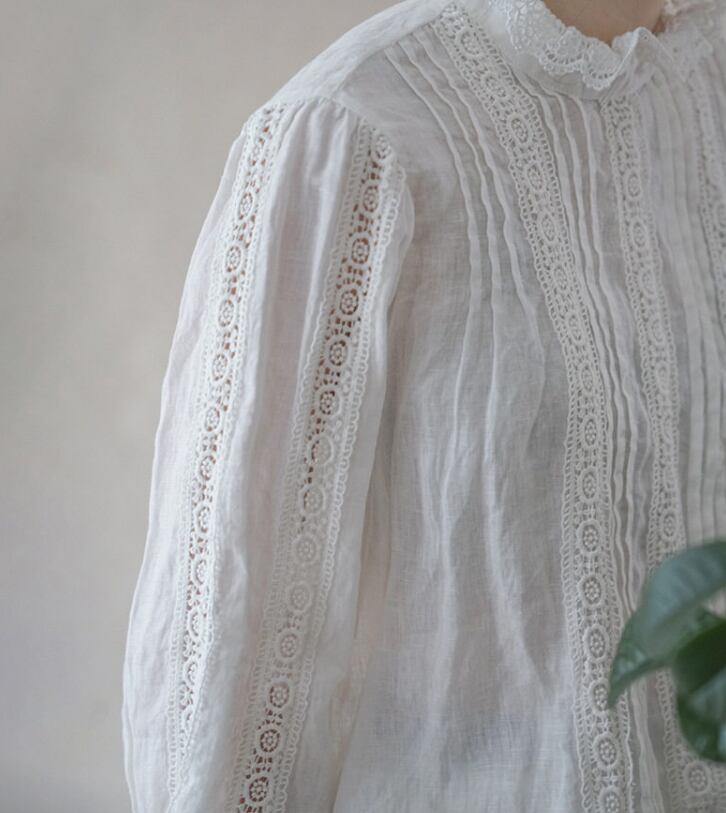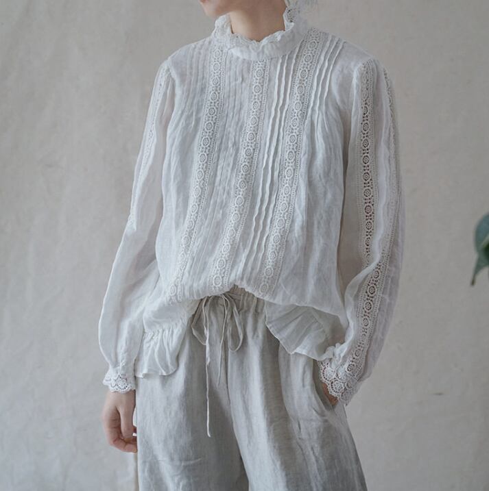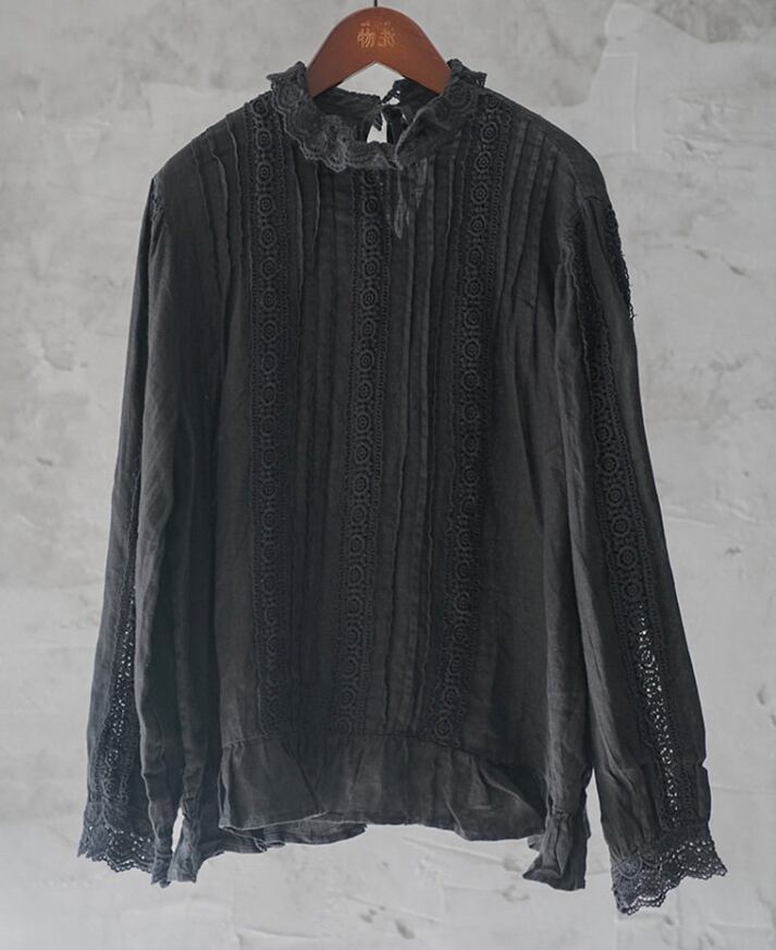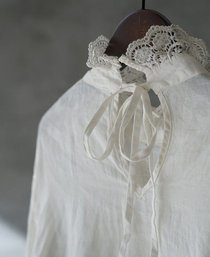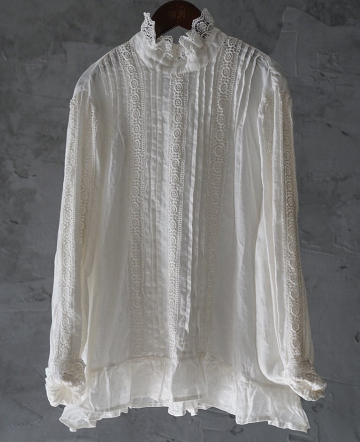 レトロフレンチな雰囲気漂うレースシャツは、スタンドカラーが凛とした印象を演出します。