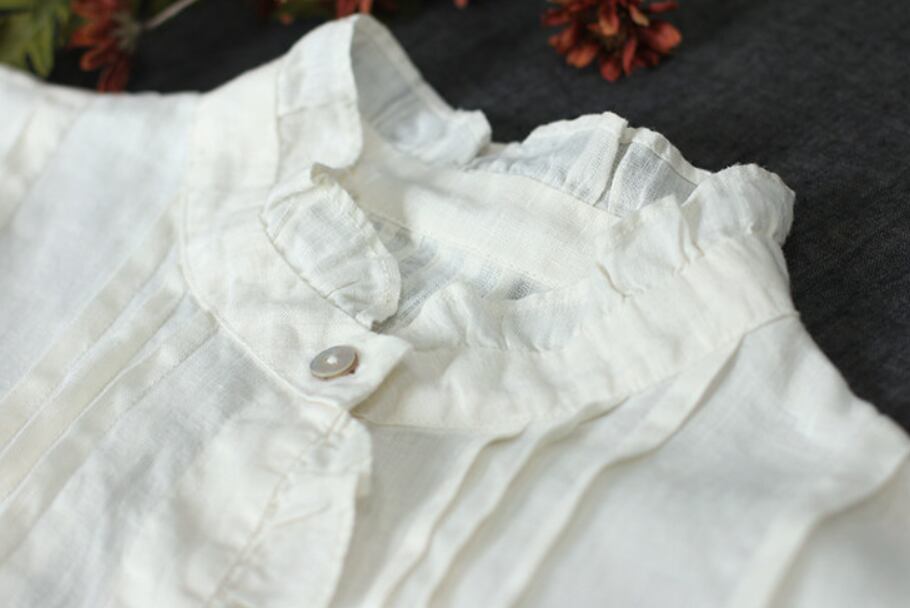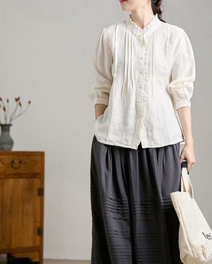 フリルカラーが印象的なリネンシャツは、Cotiらしい上品さとナチュラルな心地よさを兼ね備えた一枚です。