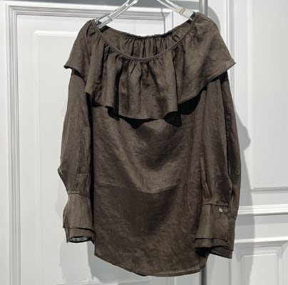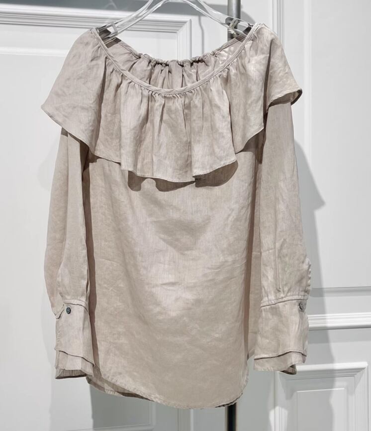 ほんのり透け感のあるオフショルダーと、やさしく揺れるフリルが印象的なリネンシャツ。