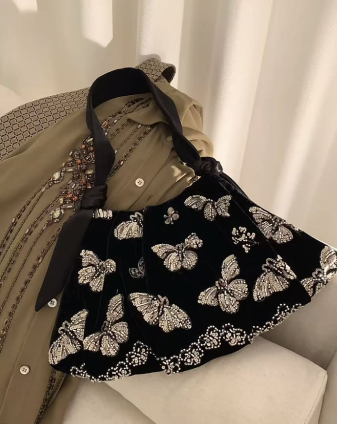 繊細なビーズ刺繍で描かれた、優雅なバタフライモチーフ。
