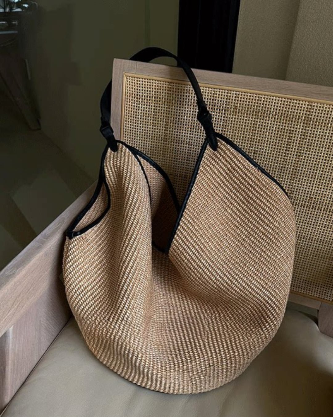 黒縁がアクセントのストロー編みバケットバッグ。