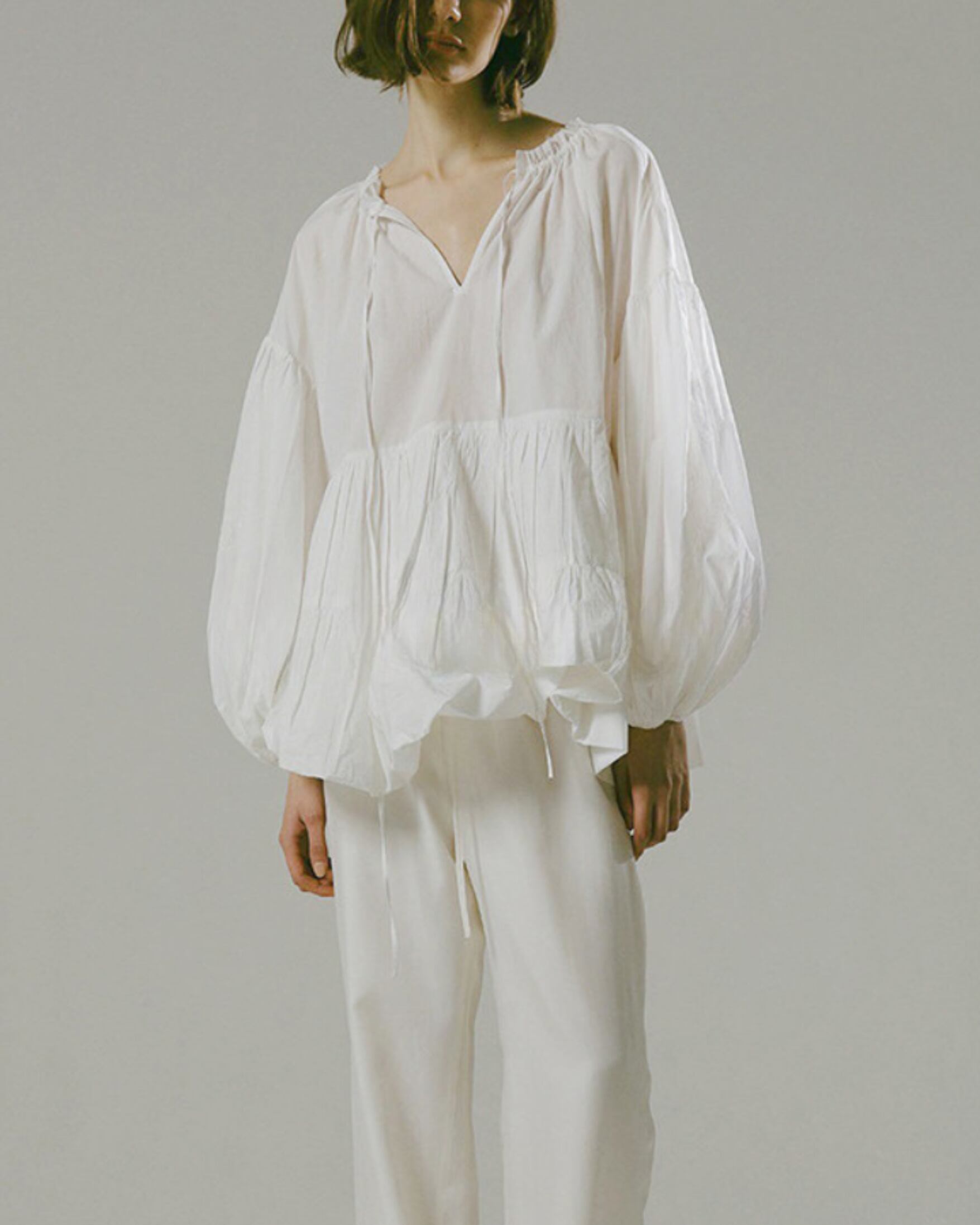 やわらかなコットンで仕立てた、ランタンスリーブのホワイトシャツ。