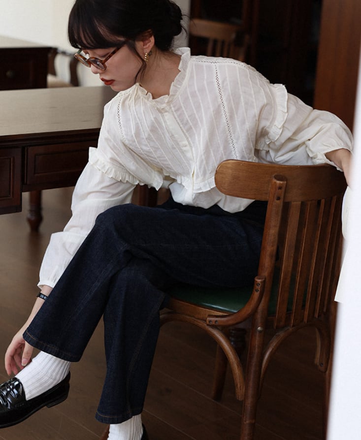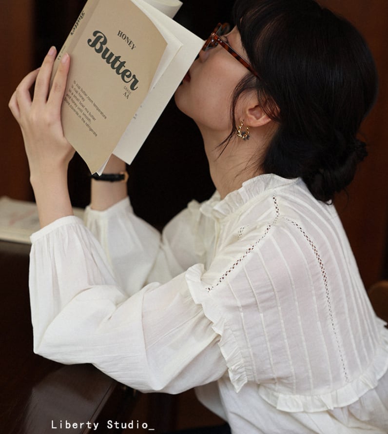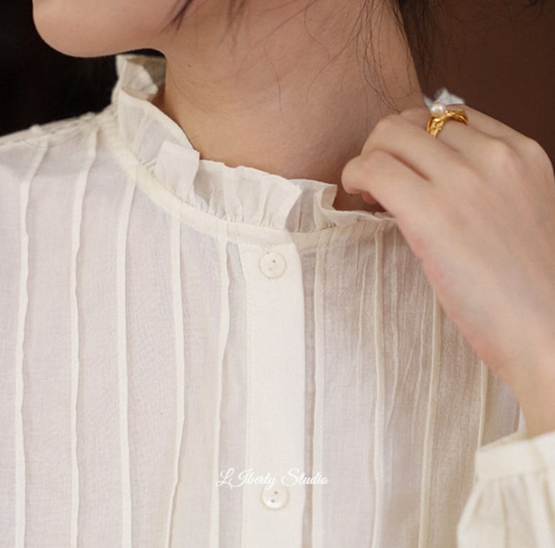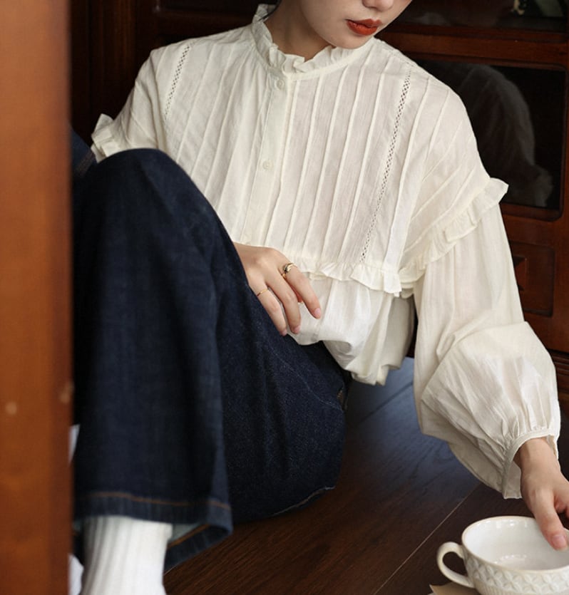 ラッフルカラー&プリーツ入りランタン袖シャツ
