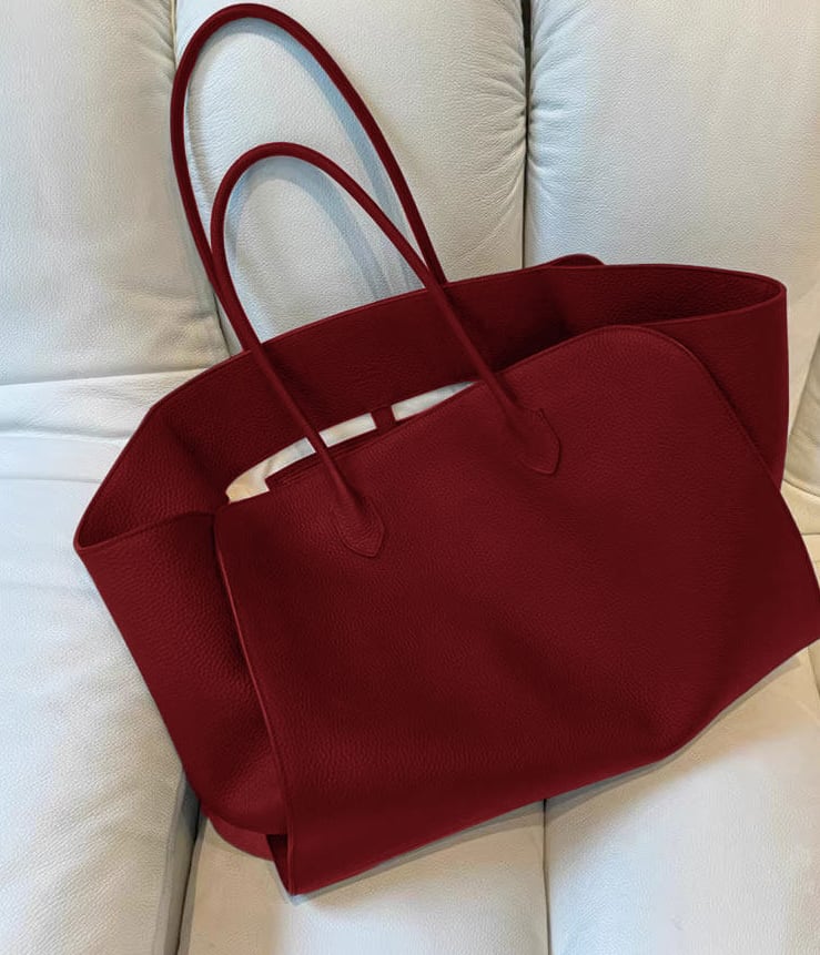 印象的なレッドカラーが目を引くレザートートバッグ。